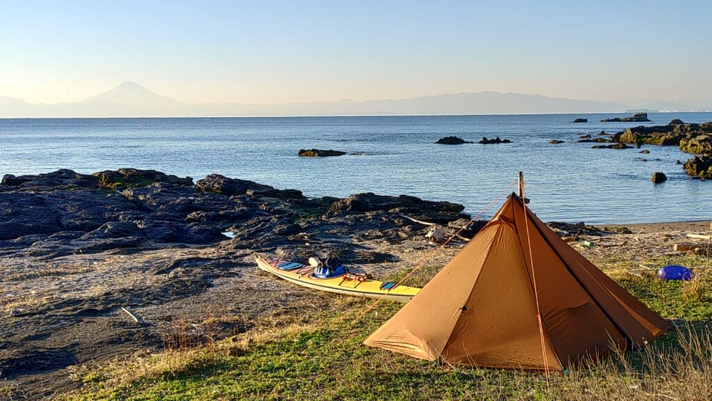 そういえば、年末のいつだったか・・・?あっ、2025年12月28日(日)から翌日の29日(月)にかけて、シーカヤックの「ハッチ」と呼ばれる荷物室に、キャンプ道具を詰み込んで近所の浜でキャンプしたんです。